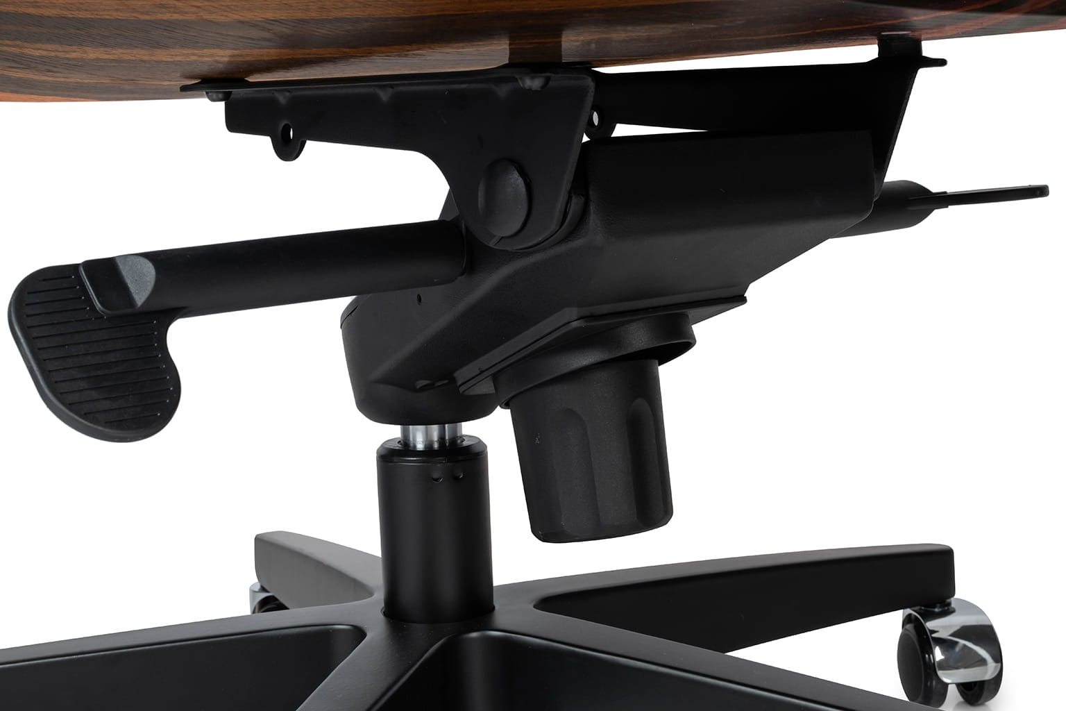 Korpus fotela został wykonany z giętej sklejki fornirowanej drewnem hebanowym. Fotel wyposażony w regulację wysokości z funkcją bujania i regulacją oporu. Całości dopełnia obrotowa podstawa z cichymi kółeczkami. Podstawa oraz elementy metalowe wykonane zostały ze stali w kolorze czarnym.