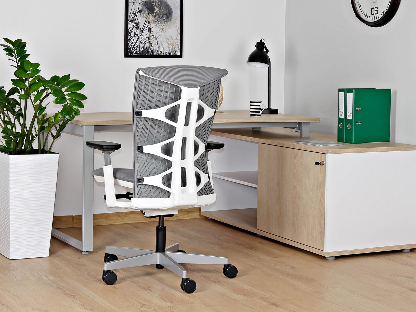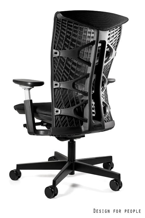 - Oparcie tapicerowane siatką lub elastomerem, konstrukcja z tworzywa w kolorze białym lub czarnym