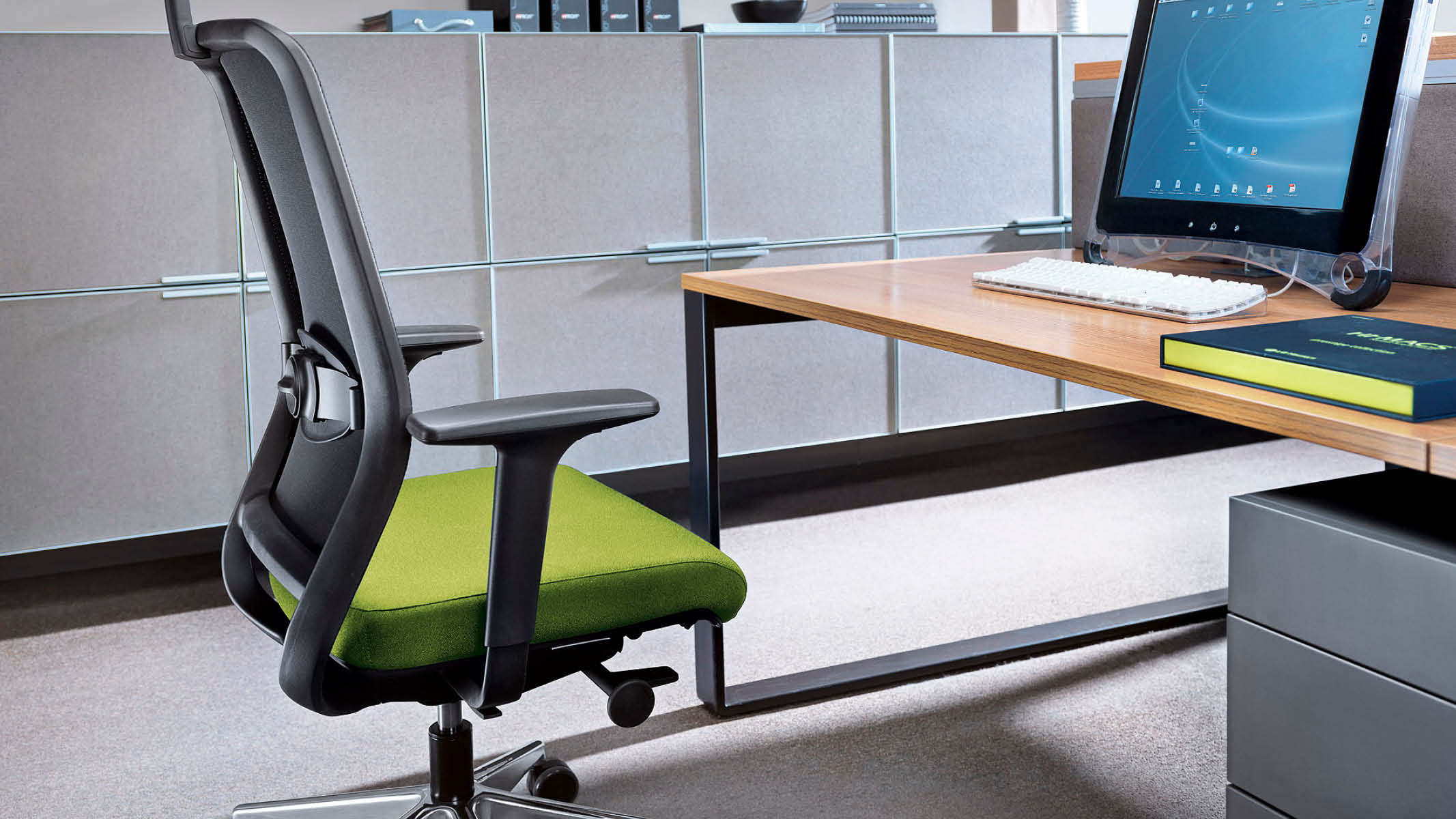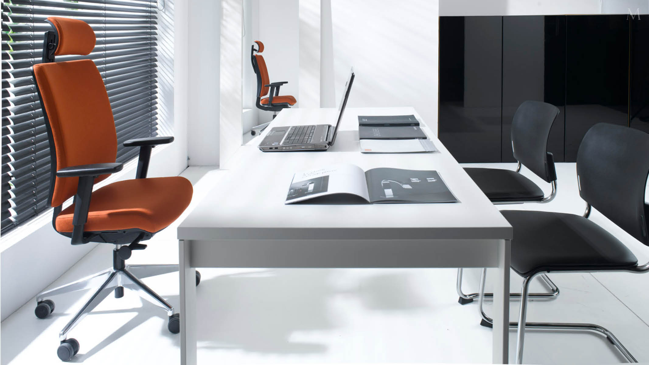 Elementem wyróżniającym krzesło jest możliwość dodatkowego pochylenia przedniej części siedziska co zapobiega uciskaniu tylnej części ud. Dzięki zastosowanym regulacjom w prosty i skuteczny sposób możemy zminimalizować dolegliwości spowodowane długotrwałą pracą przy biurku, poprawiając efektywność wykonywanej pracy. Fotel jest dostepny w wersji podstawowej pracowniczej oraz w wersji menedżerskiej z zagłówkiem. Dostępna jest wersja z oparciem tapicerowanym lub siatkowym.